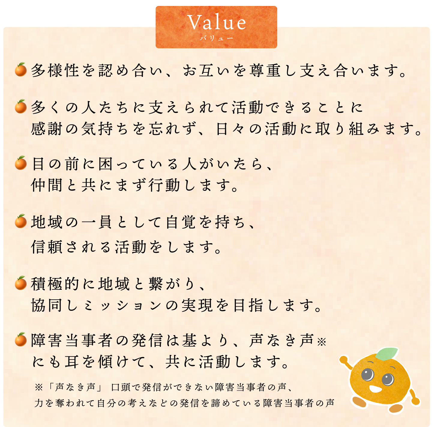 障害のある仲間たちとともに、地域と繋がり、挑戦し、当法人に関わる一人一人の人生がより豊かになっていくよう「感謝」と「情熱」をいつも心に持って真摯に事業展開をしていきます。